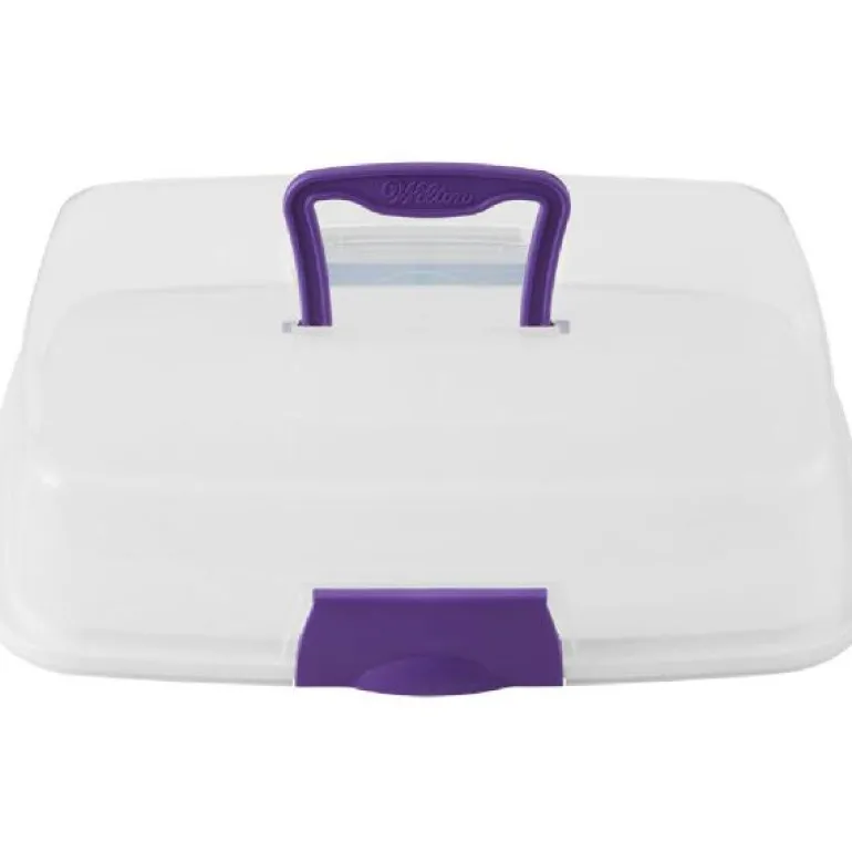 Den rektangulære kaketinen fra Wilton er ypperlig til avlange kaker, men også fin til å bære rundt på cupcakes og muffins. Den har et vendbart cupcakebrett som rommer 12 standard eller 24 mini cupcakes.