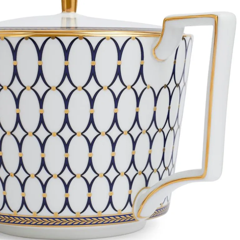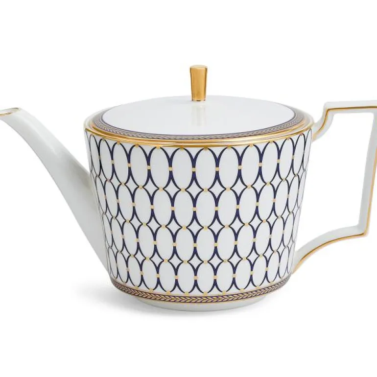 Renaiss Gold Teapot 1L. Med inspirasjon fra Wedgwoods betydelige arkiv er Renaissance Gold gjennomsyret av autentisitet, samtidig som den opprettholder en moderne, klassisk stil. Ved å kombinere elegante interiørdesignmotiver med den rene, ovale formen til den berømte Wedgwood Cameo, sammen med marineblått, 22 karat gull og dristige florentinske aksenter fanges dette i et slående, elegant mønster. Perfekt til formelle middager, men kan også brukes som et storslått alternativ til hverdags. Ekspressive mønstre er flotte i kombinasjon med vanlig hvitt, slik at man kan skape sitt eget uttrykk i borddekkingen.