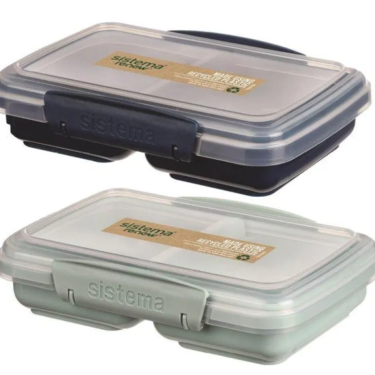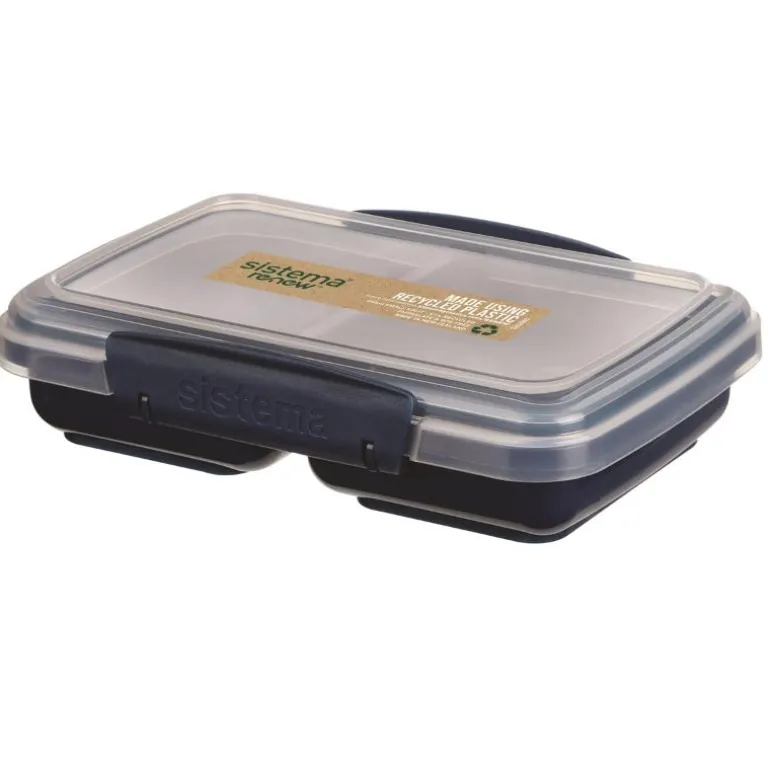 Praktisk matboks fra Sistema, laget i gjenbrukt plast fri for BPA og ftalater. Matboksen er inndelt i to rom, noe som gjør den god til oppbevaring eller som snackmatboks. En fin liten matboks som passer godt i størrelse til skolebruk. Tåler oppvaskmaskin, fryser og mikrobølgeovn (uten lokk).