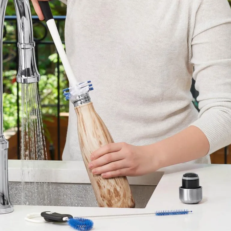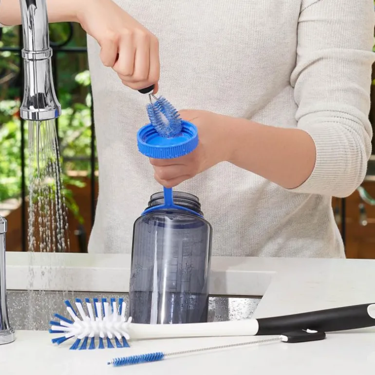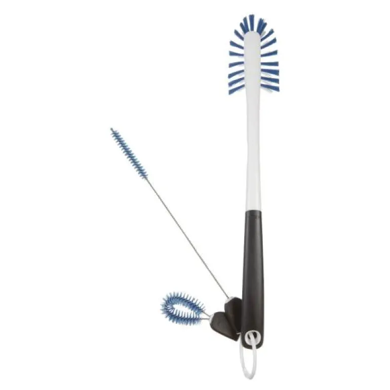 Rengjøringssettet inneholder en lang børste til innvendig rengjøring av flasker, en lang, smal børste til rengjøring av sugerør og en detaljebørste til rengjøring av lokk og de stedene det er vanskelig å komme til. Alle tre børstene er laget av bløt, robust nylon, og de sitter i en ring, så de holdes samlet under i kjøkkenskuffen.