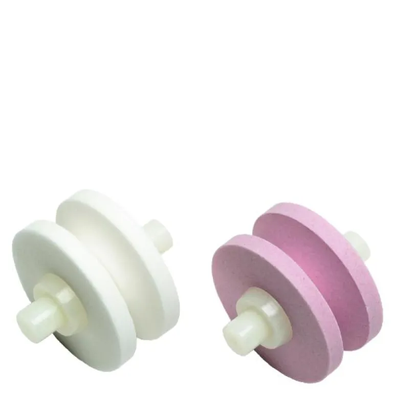 Utskiftbare slipeskiver til Globals knivsliper. Slipeskivene har to forskjellige grove størrelser: en middels grov (240 i kornstørrelse) og en fin (600 i kornstørrelse).
