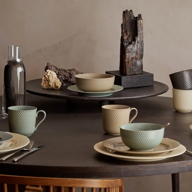 Alle de fire vakre fargene i Rhombe Earth-serien er, akkurat som i Lyngby Porcelæns populære Rhombe Color-serie, nøye utvalgt av designduoen Stilleben, som består av Ditte Reckweg og Jelena Schou Nordentoft. Bruk alle de forskjellige Rhombe Earth-delene sammen i borddekkingen, og la tallerkenene i ulike størrelser titte frem under hverandre, slik at de varme fargene får lov til å snakke sammen. Tallerkenene, krusene og skålene i Rhombe Earth er selvfølgelig også både sammen og hver for seg naturlige supplement til din Rhombe Color-samling eller i kombinasjon med det klassiske hvite Rhombe-serviset, der de grå og brune nyansene på de enkelte Rhombe Earth-delene sammen med Lyngby Porcelæns linjer til perfeksjon vil skape et både moderne og avslappet uttrykk og stå vakkert mot det hvite porselenet.