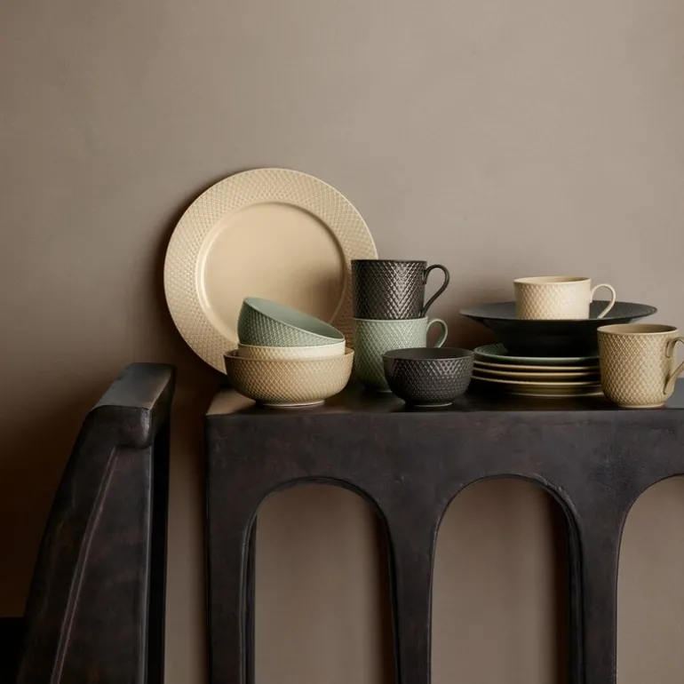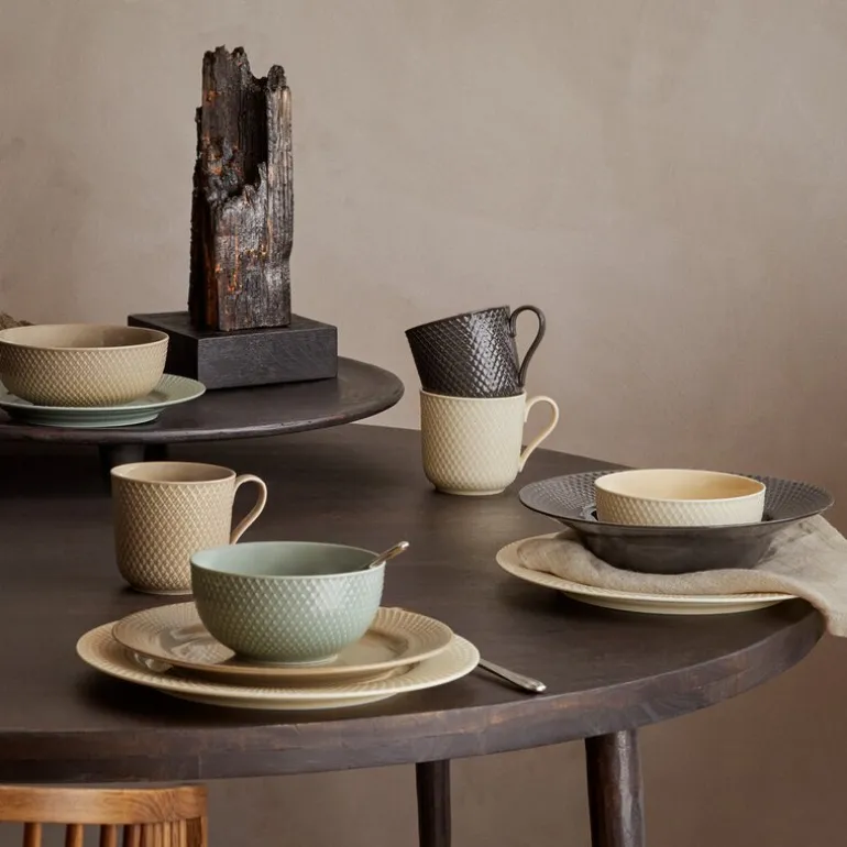 Alle de fire vakre fargene i Rhombe Earth-serien – marble, clay, moss og slate – er, akkurat som i Lyngby Porcelæns populære Rhombe Color-serie, nøye utvalgt av designduoen Stilleben, som består av Ditte Reckweg og Jelena Schou Nordentoft. Bruk alle de forskjellige Rhombe Earth-delene sammen i borddekkingen, og la tallerkenene i ulike størrelser titte frem under hverandre, slik at de varme fargene får lov til å snakke sammen. Tallerkenene, krusene og skålene i Rhombe Earth er selvfølgelig også både sammen og hver for seg naturlige supplement til din Rhombe Color-samling eller i kombinasjon med det klassiske hvite Rhombe-serviset, der de grå og brune nyansene på de enkelte Rhombe Earth-delene sammen med Lyngby Porcelæns linjer til perfeksjon vil skape et både moderne og avslappet uttrykk og stå vakkert mot det hvite porselenet.