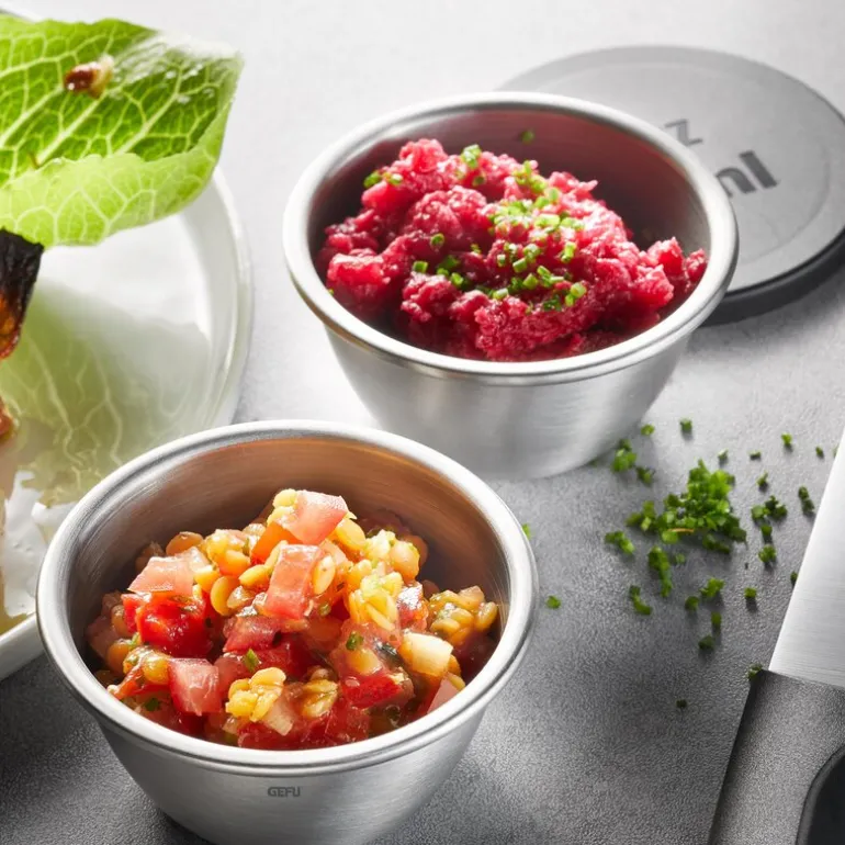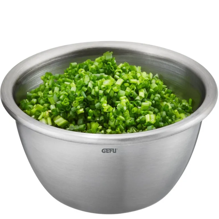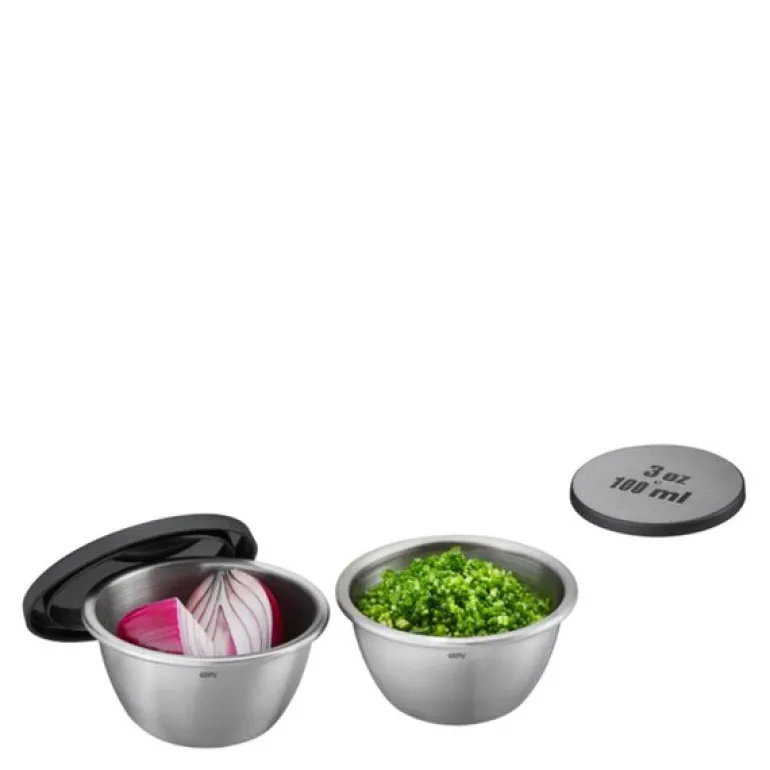 Rino bollesett fra Gefu består av to skåler på 100 ml, laget i rustfritt stål med en elegant svart finish. De praktiske skålene er designet for å kunne stables og leveres med aromalokk som holder innholdet friskt og tett. Perfekte til oppbevaring av urter, hakket løk, smør med urter eller ulike dipper i kjøleskapet. Skålene er produsert av høykvalitets materialer som rustfritt stål og slitesterk plast, men de er ikke egnet for vask i oppvaskmaskin. Gefu er kjent for sitt funksjonelle design, utviklet i samarbeid med designstudioet invivo design i Berlin. Hvert produkt er laget med fokus på detaljer og kvalitet, med tanke på å oppfylle kundenes krav til praktiske og stilrene løsninger.