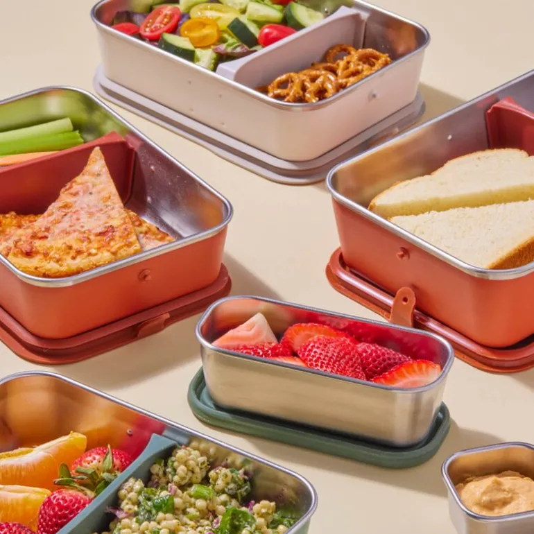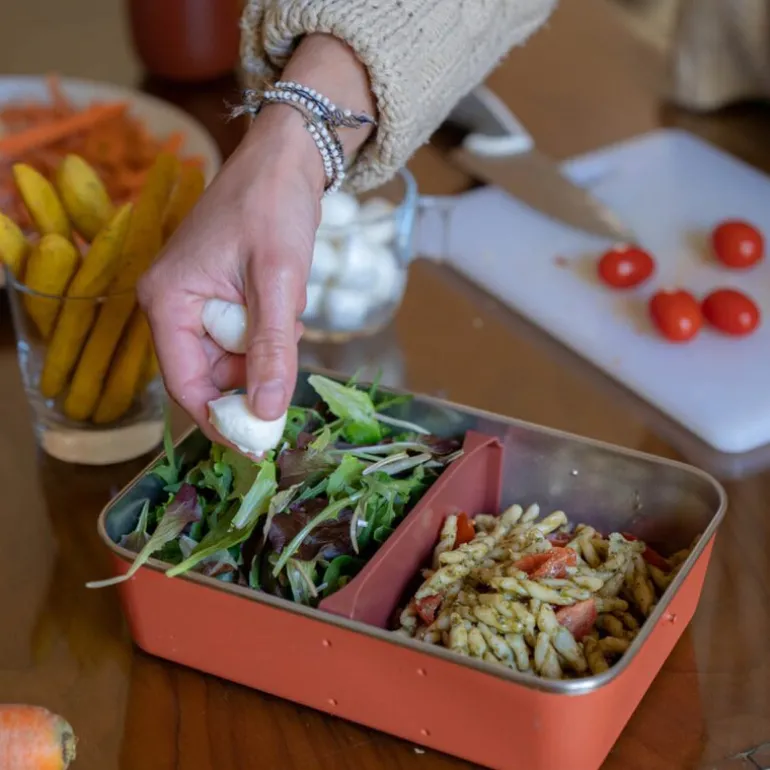 Beholderen er laget av 90 % resirkulert 18/8 rustfritt stål, og tåler både ovn og oppvaskmaskin. Den flekker ikke, ruster ikke, knuser ikke og holder ikke på lukt. En robust og bærekraftig løsning for alle dine måltider utenfor hjemmet.