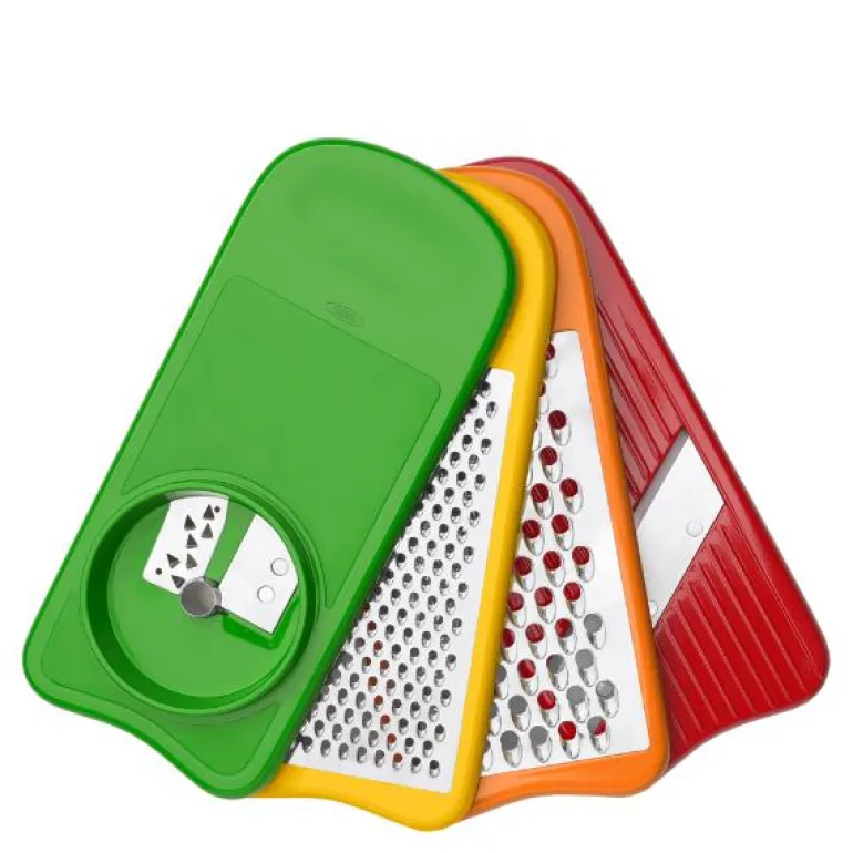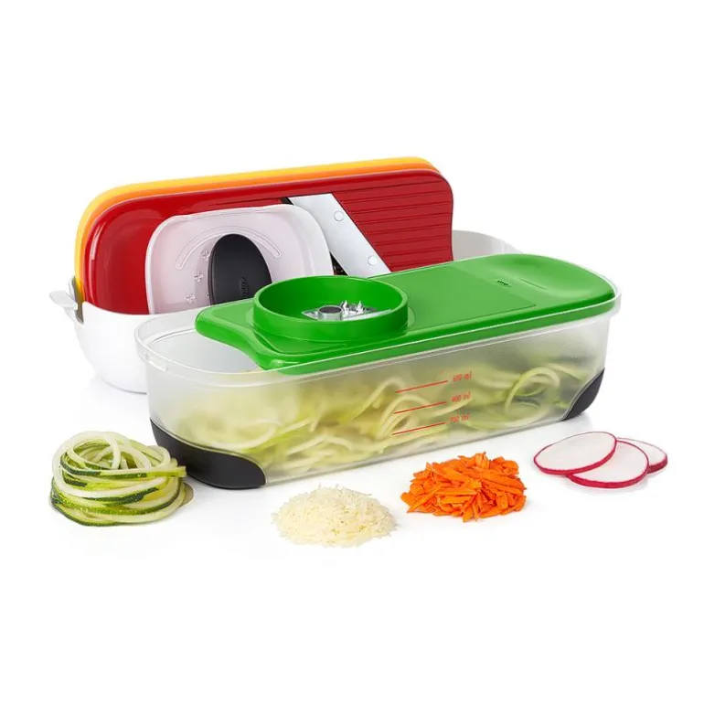 Settet inneholder alt du kan ønske deg av rivjern i en smart, kompakt oppbevaringsboks med et lokk som også fungerer som oppsamler. Det har non-slip føtter som står godt fast på underlaget når du arbeider med det. Settet består av et glatt, et grovt og et medium rivjern, et spiralizer rivjern til grønnsakspaghetti og en holder. Du kan nøyes med å vaske opp de delene du har brukt, og de tåler oppvaskmaskin.
