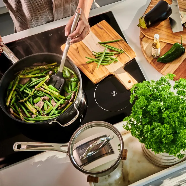 Gryten har en 5,3 mm tykk induksjonsbunn med en aluminiumskjerne på 4 mm, omgitt av stål for bedre varmeledning. Den fungerer på alle typer koketopper, og tåler bruk i ovn opp til 300 grader. Håndtakene er varmeisolerende og gir et sikkert grep uten behov for grytekluter.