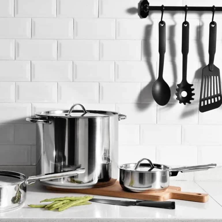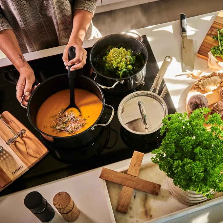 Rix gryte og panne serie er produsert i kvalitetstål 18/8 med blankpolert overflate. 5,3 mm induksjonsbunn, 0,8 mm vegg og 3 lag med Select slipp-lett belegg, som gjør at mat ikke fester seg så lett i bunnen. Bunnen har aluminiumskjerne på 4mm som er overtrukket med stål på begge sider. Aluminiumskjerne gjør at varmen ledes optimalt og gir rask oppkoking som sparer energi.