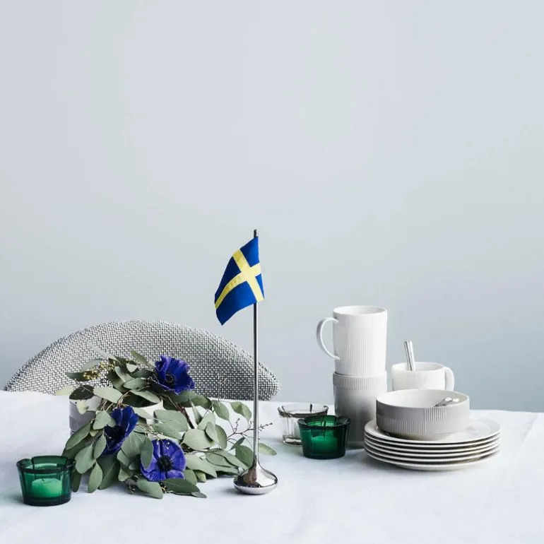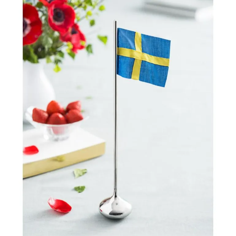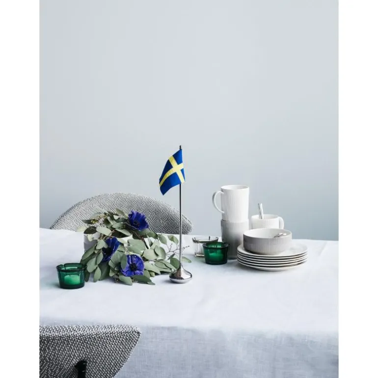 Bordflagget fra Rosendahl står pent på bordet, der flagget er festet innvendig i den blankpolerte flaggstangen. Det er derfor ingen synlige snorer. Flaggstangen måler 35 cm og har en tung avrundet fot, slik at flagget kan vippe lett.