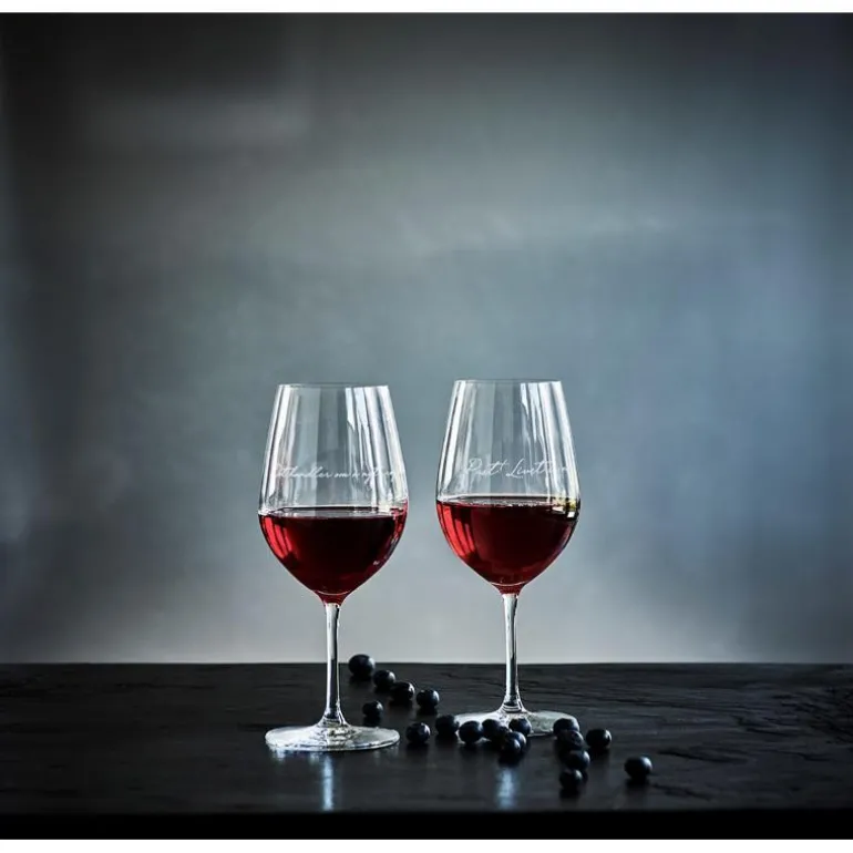 Rødvinsglass med lekker utforming og gravering, Pust Livet er nå.