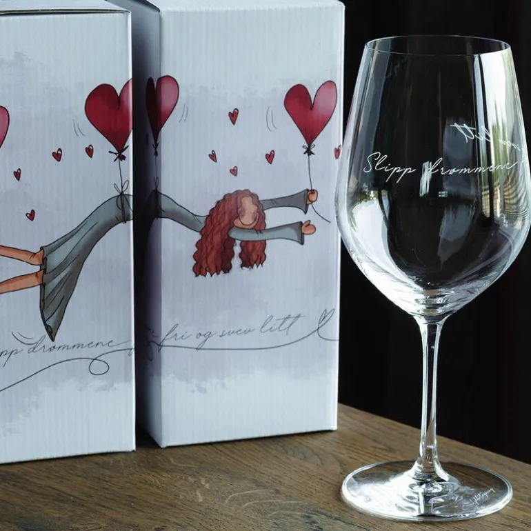 Rødvinsglass med lekker utforming og gravering. Slipp drømmene fri og svev litt. Glassene er utformet slik at en både kan nyte rødt og hvitt, men også lekre å servere en frisk juice.