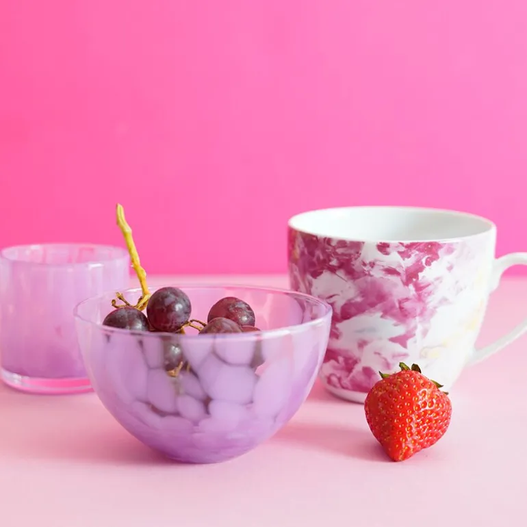 I tillegg har Camilla Prytz designet to munnblåste og håndlagde glassgjenstander i vakkert kunstglass; TELYKT H 6 cm og SKÅL D 10 cm. Glasset er gjennomskinnelig med rosa smeltede glassbiter som passer fint til alle andre farger. Telykten ser magisk ut når glasset blir opplyst innenfra. Skålen kan brukes til alt spiselig eller til favorittsmykkene. Vasen er enkel og ikke så stor.