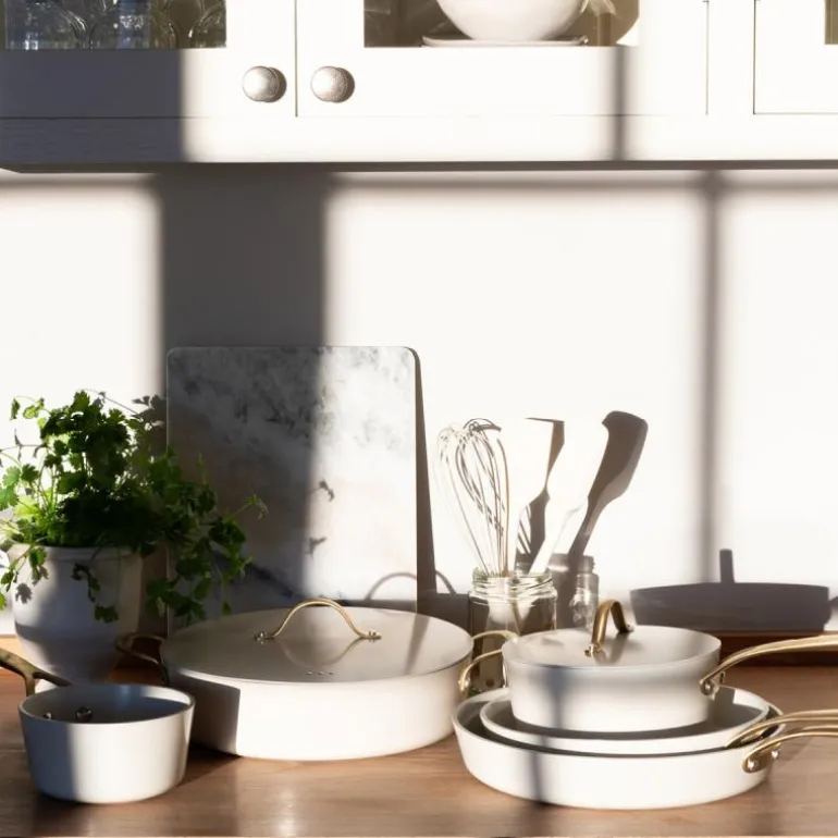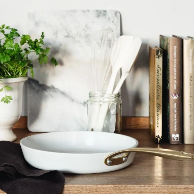 Hvit stekepanne 24 cm Heirol. Royal Pearl er en ny elegant serie med gryter og stekepanner fra det finske merket Heirol. Pannene har et kermaisk belegg uten tilsatt PFAS. Stekepannen er laget av resirkulert aluminium og passer til alle komfyrtyper. Den kan også brukes i ovnen opp til 220 grader og har tre års garanti.