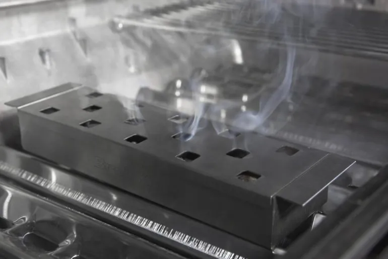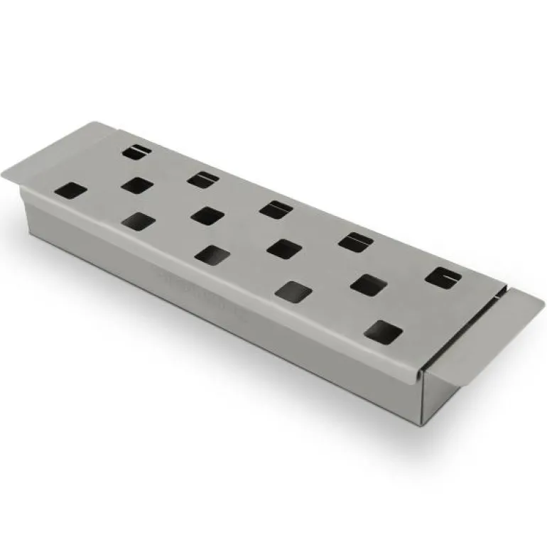 Røykboks i rustfritt stål med håndtak og leddet lokk. En enkel og lett måte å få røyksmak på. 33,5×9,5×3 cm.