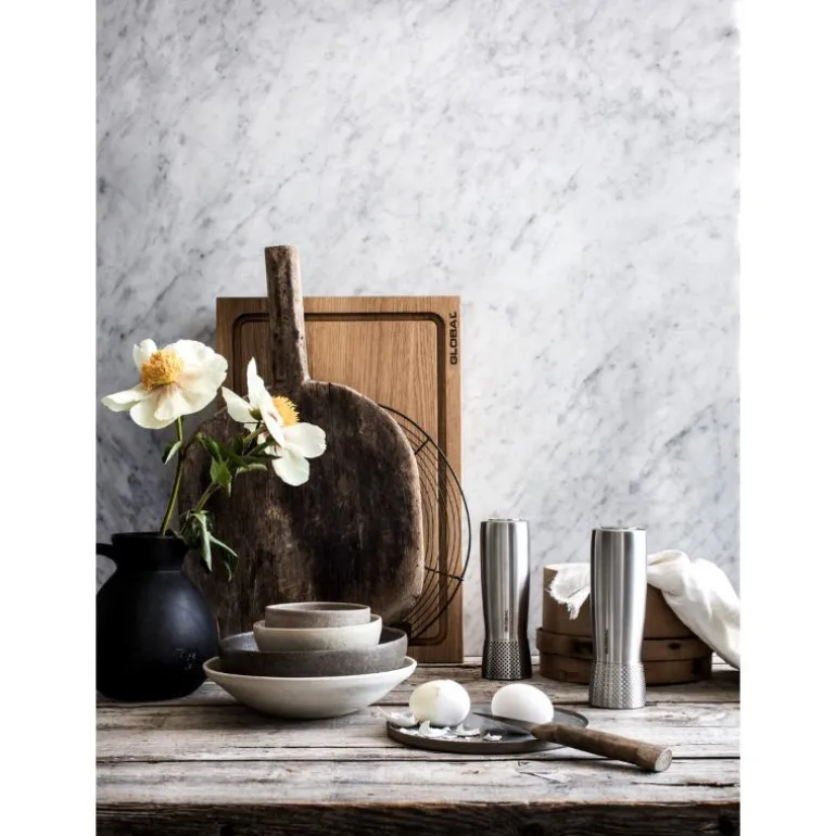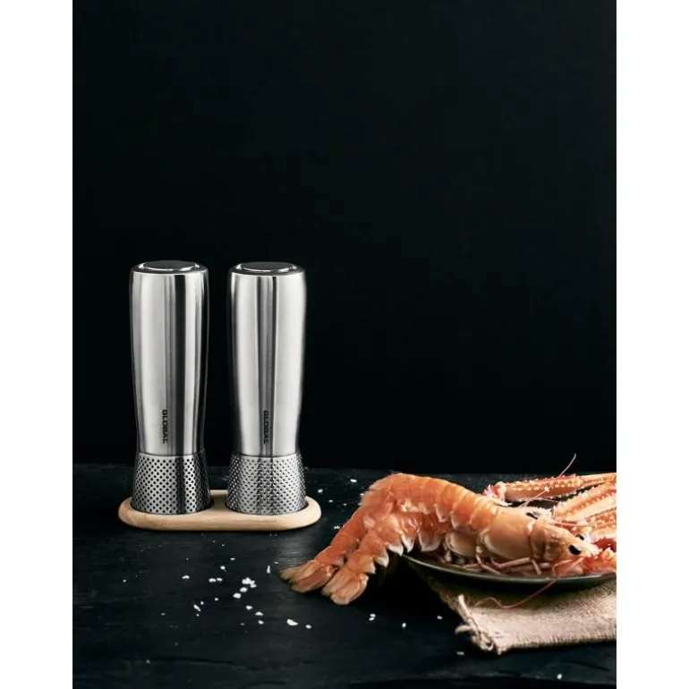 G/SP-3 salt og pepperkvern 18,5 cm fra Global. Et sett bestående av en saltkvern og en pepperkvern. Kvernene er laget av rustfritt stål og har samme stilige, robuste design som Globals øvrige sortiment. Det som skiller dem er at pepperkvernen har svarte prikker i bunnen mens saltkvernen har prikker i en nøytral farge. Den keramiske kvernen er justerbar, noe som gjør at du enkelt kan justere kornstørrelsen etter ønske.