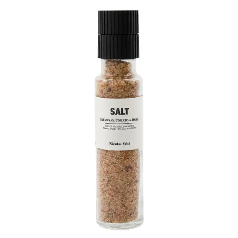 Nicolas Vahé Salt med Parmesan, Tomat og Basilikum på 300g leveres med en keramisk kvern som gir ekstra finmalte krydder for optimal smak. Denne smakskombinasjonen hever både pasta- og salatretter med en klassisk blanding av parmesanost, soltørkede tomater og aromatisk basilikum. Det er den perfekte måten å ta matlagingen din fra god til fantastisk ved å tilføre et smakfullt, middelhavsinspirert preg til rettene dine.