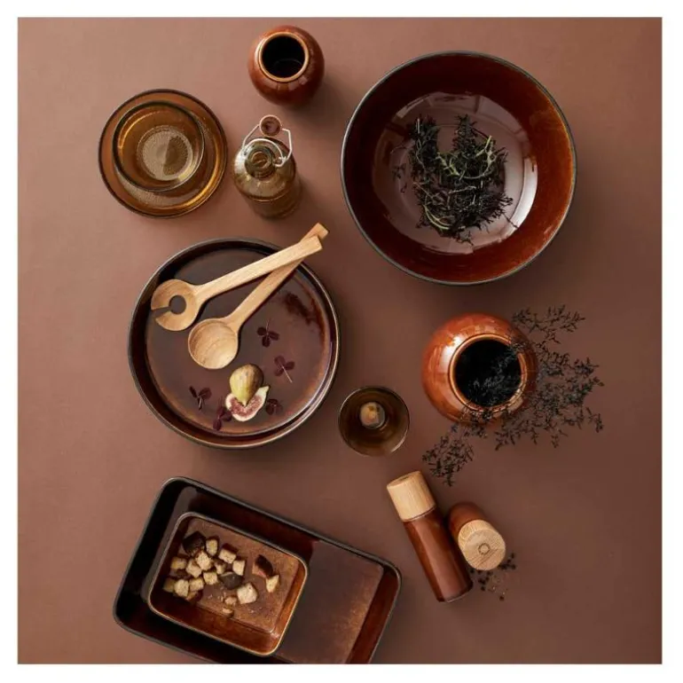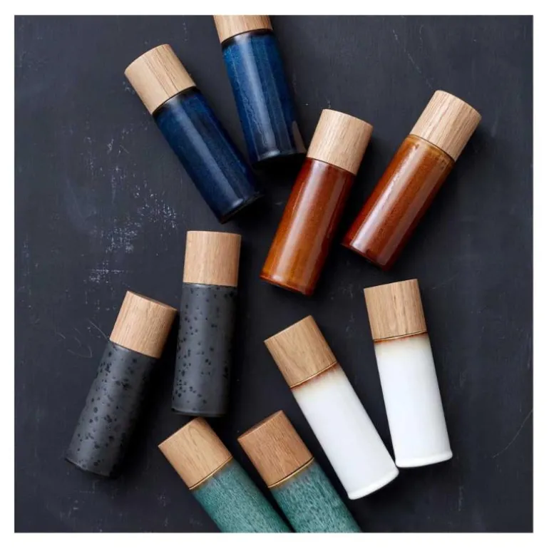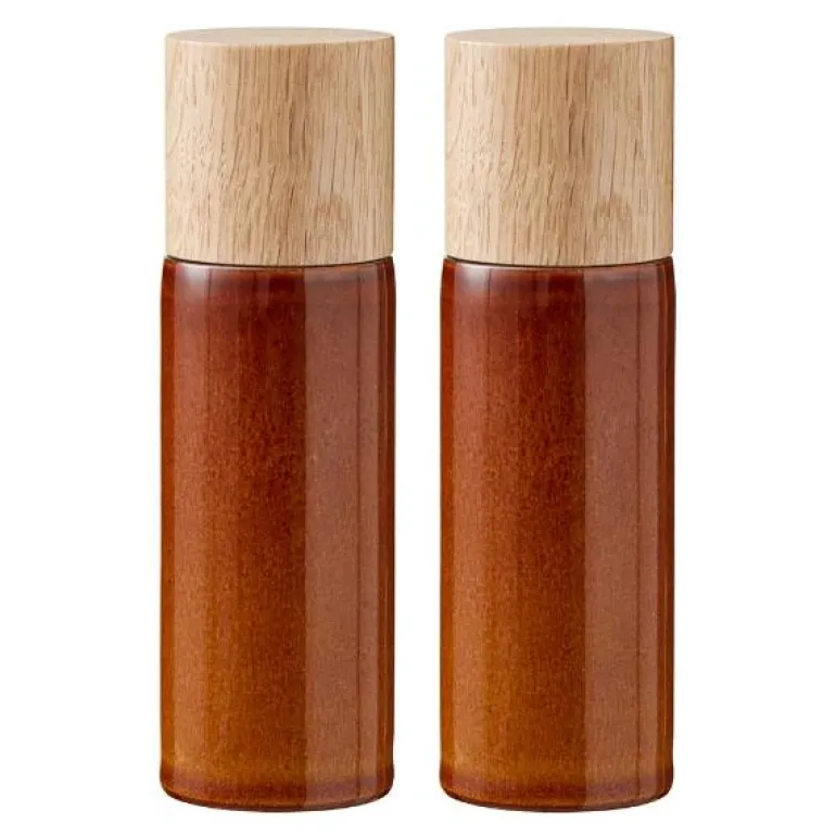 Salt- og pepperkvernsett i blankglasert steintøy, med topp av eik. Designen er enkel og elegant, og kvernene ligger godt i hånden. Kvernen er keramisk, og leveres med fem års garanti. Vi anbefaler at toppen av eik vedlikeholdes løpende med nøytral olje, slik at treets glød beholdes.