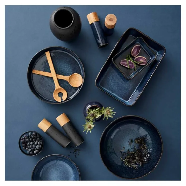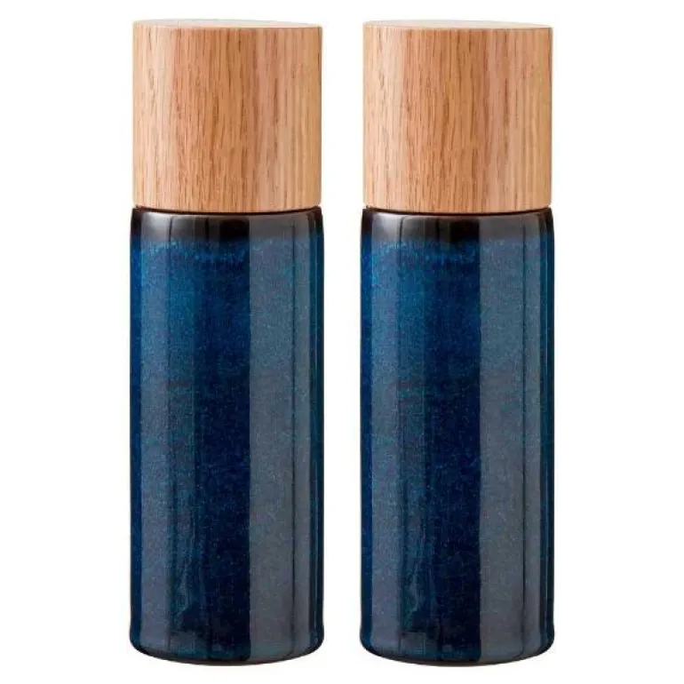 Salt- og pepperkvernsett i blankglasert steintøy, med topp av eik. Designen er enkel og elegant, og kvernene ligger godt i hånden. Kvernen er keramisk, og leveres med fem års garanti. Vi anbefaler at toppen av eik vedlikeholdes løpende med nøytral olje, slik at treets glød beholdes.