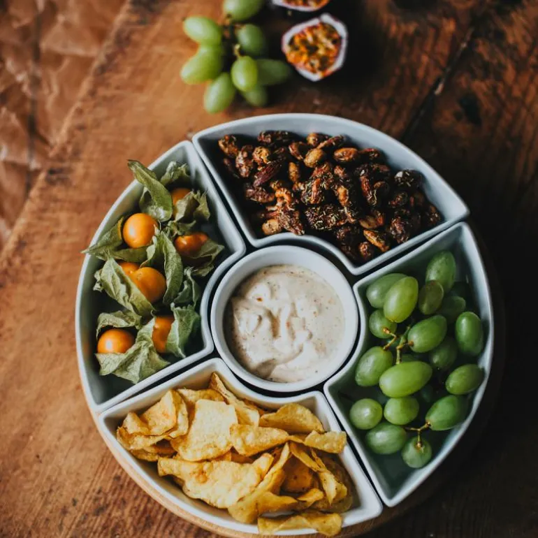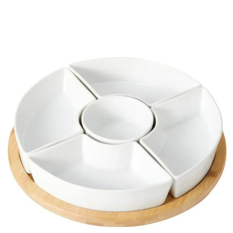 Forvandle serveringen din med det elegante Samara Skålset i 6 deler med en snurrende bambubrikke. Diameter på 28 cm og en snurrende bambubrikke.