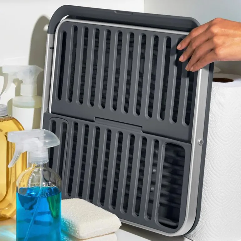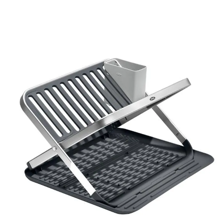 Elegant tørkestativ til oppvasken med rustfritt aluminium på sidene. Stativet har plass til tallerkener, skåler, glass, kopper, gryter, mm. Det medfølger en særlig holder til bestikk, som kan monteres på stativet. Stativet kan foldes helt flatt for kompakt oppbevaring. Bunnen kan rengjøres i oppvaskmaskinen.