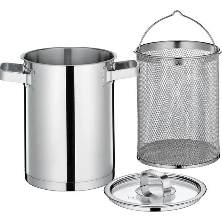 Aspargeskokeren er for dem, som vil ha alt ut av aspargesen. Stengene står i den tynne gryten med hodet høyt, så de følsomme hodene koker særligt mildt. Sandwich-basen, som er velegnet til alle typer ovner, fordeler varmen gjevnt. Innsatsen med håndtak gjør det lett for deg å ta asperges ut og drene dem.