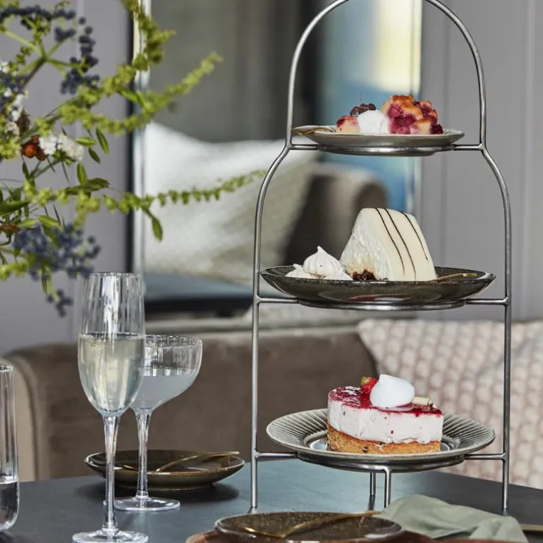 Sana tallerkenstativ silver finish, fra House Doctor. Feeling good? Inviter gjestene dine på en deilig afternoon tea servert på dette tallerkenstativet fra House Doctor. I en 3-lags design skapes et klassisk preg på borddekkingen. Lag noen små smørbrød og kaker, finn dine beste tallerkener og plasser dem på stativet. Den egner seg like godt til søtsaker som til brunsj eller en søndagsfrokost. Bruk den når du vil gjøre noe ekstra for deg selv og dine gjester.