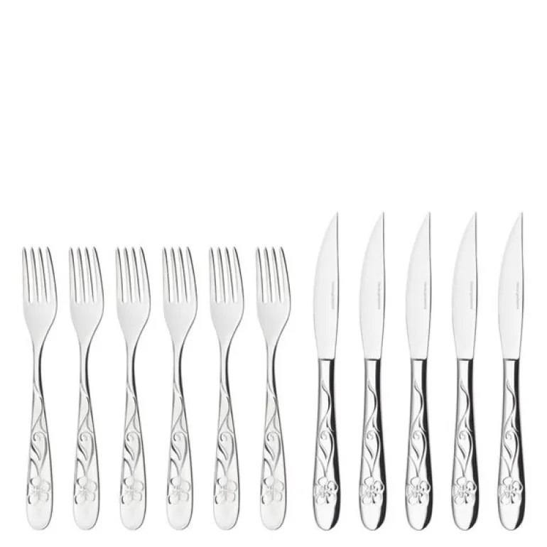 De seks biffknivene har fintagget knivblad som skjærer presist gjennom kjøtt, og de seks spisegaflene gir god balanse og grep. Knivene måler 23,4 cm og gaflene 21 cm. Produsert i slitesterkt 18/10 stål, tåler oppvaskmaskin og leveres i en stilfull gaveeske – perfekt for både hverdag og fest.