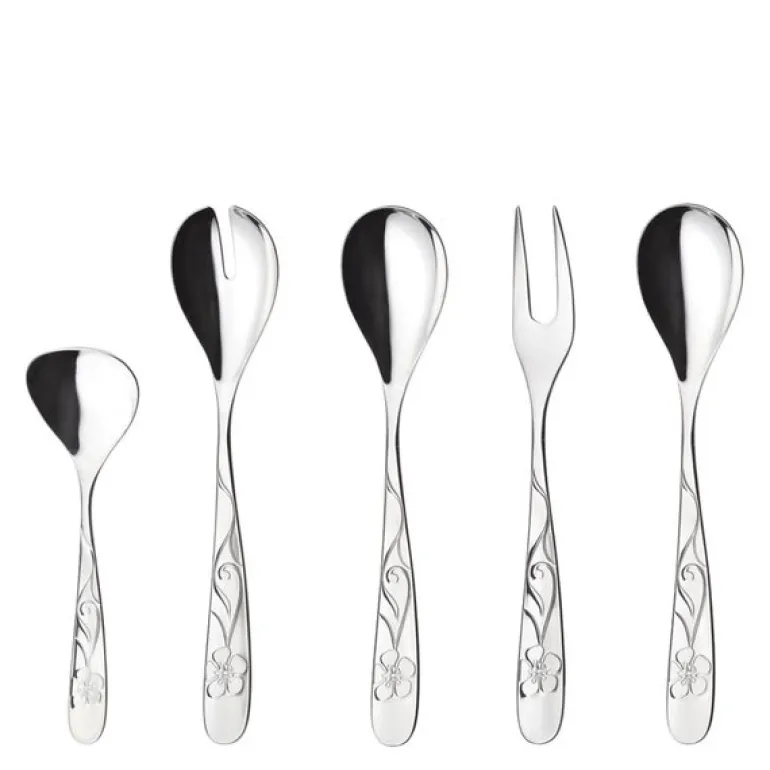 Settet inneholder to serveringsskjeer (24 cm), én salatgaffel (23,9 cm), én serveringsgaffel (23,9 cm) og én sausøse (20 cm). Alle deler er laget i solid 18/10 stål, tåler oppvaskmaskin og leveres i en elegant gaveeske – perfekt for komplette serveringer ved bordet.
