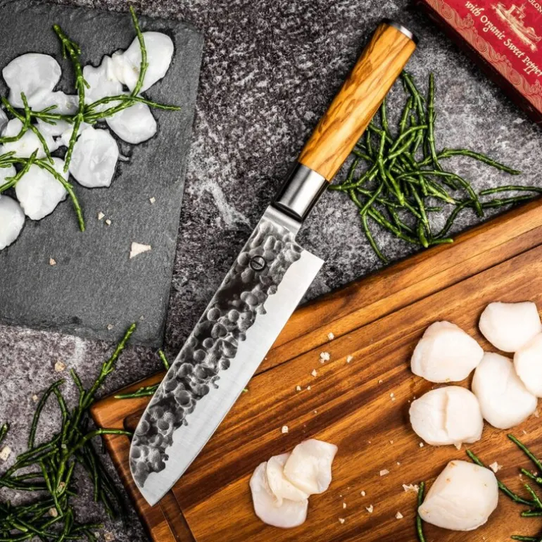 Denne santokukniven fra Forged Olive-serien er et allsidig verktøy som kombinerer japansk presisjon med europeisk kvalitet. Bladet på 18 cm håndterer enkelt skjæring, terningkutting og hakking – alt i én kniv.