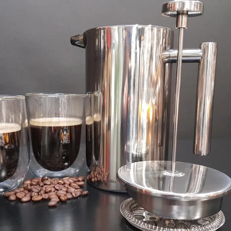 Sett lokket med silinnsatsen på pannen og vent i minst 4 minutter. Skyv deretter filteret sakte ned og se frem til en fullt aromatisk kopp kaffe. Det dobbeltveggede robuste rustfrie stålet holder favorittdrikken din varm. Den praktiske og godt utformede enheten egner seg også for tedrikkere. SARA leverer seks eller åtte kopper, avhengig av modell. Hell kaffepulver med varmt, ikke-kokende vann i. SARA leverer seks eller åtte kopper, avhengig av modell.