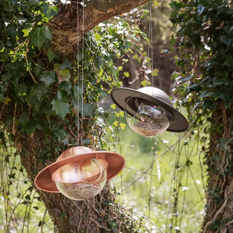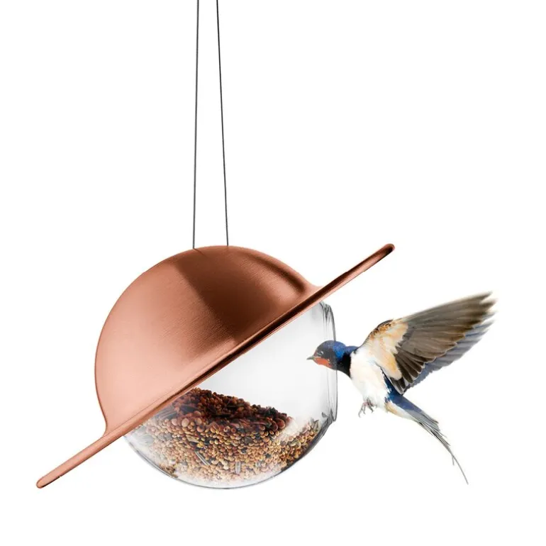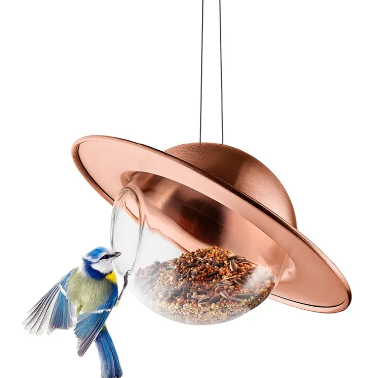 Saturn fuglemater 15×24 cm kobber fra Eva Solo. Inviter nabolagets fugler til en flott middag. Fuglemateren har et dekorativt halvtak som ikke bare holder fôret tørt, men også forhindrer at store fugler snapper maten fra de små. Takket være kulens gjennomsiktige glassbunn er det lett å se når det er tid for å fylle på med fuglefôr – selv på avstand. Du trenger heller ikke uroe deg for vedlikehold; materialene er værbestandige og designet for å motstå all slags vær året rundt. Vær oppmerksom på at kobberet med tiden vil oksidere og få en fin patina. Hvis du vil beholde kobberets blanke utseende, kan du pusse fuglemateren med vanlig kobberpuss.