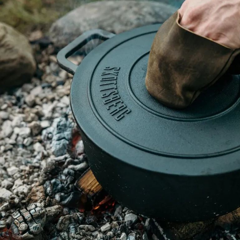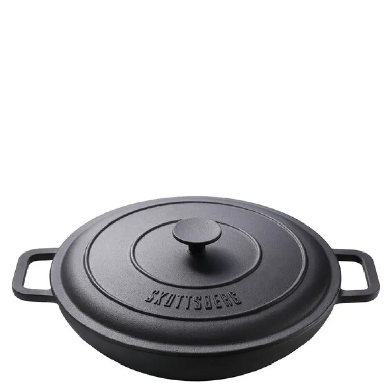 Denne sautépannen fra Skottsberg er laget i solid støpejern og måler 31,5 cm. Pannen er innbrent med vegetabilsk olje, noe som gir en naturlig non-stick-effekt og gjør den klar til bruk med en gang. Den tykke bunnen holder godt på varmen og sørger for jevn tilberedning.