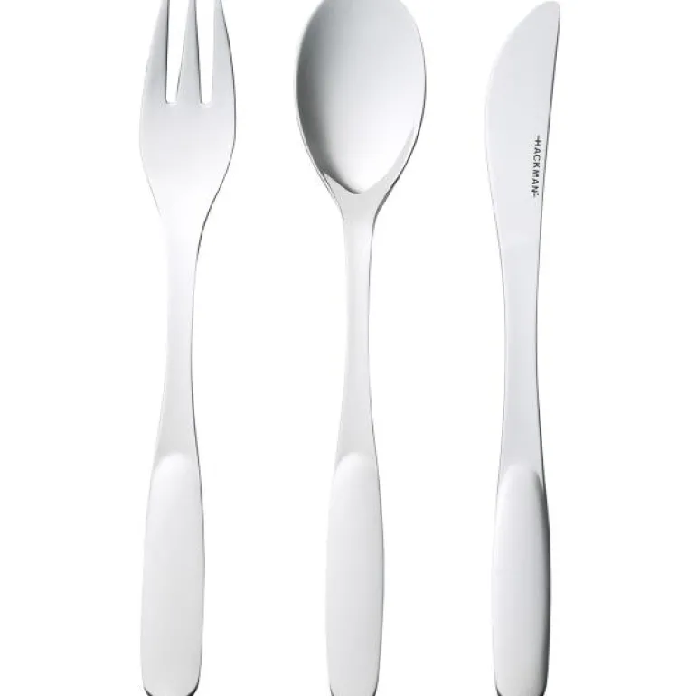 Savonia Barnesett 3 Deler. Hackmans Savonia-bestikk i rustfritt stål ble designet i 1967 av den tyske designeren Adolf Babel og er av høy kvalitet, tidløst og nyskapende. Savonias sjarm ligger i det enkle, men funksjonelle designet som passer til enhver anledning og borddekking. En ekte designklassiker. Tåler oppvaskmaskin.