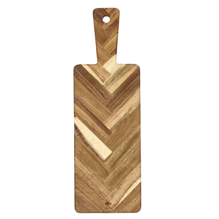 Holm serveringsbrett i akasietre er et elegant valg for å presentere mat på en stilfull måte. Med målene 46 x 15 x 1,5 cm og et vakkert fiskebeinsmønster, er brettet perfekt til servering av pizza, kjøttpålegg, bruschetta, ost og andre delikatesser.