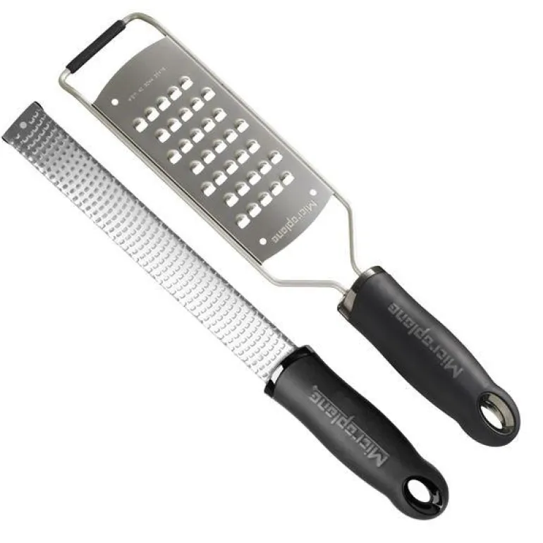 Microplanes gavesett består av en Premium Classic Zester og et ekstra grovt rivjern fra Gourmet Serien. Begge har det velkjente svarte softgrip-håndtaket.