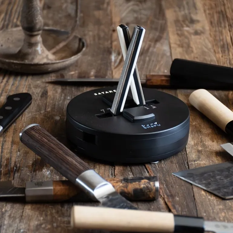 Satake Shāpu er en høykvalitets, manuell knivsliper utviklet for å gi knivene dine den perfekte skarpheten, uansett om det er en japansk kniv med 15°-18° egg eller en europeisk kniv med 20°-23° egg. Med sin patenterte design og Self Adjusting Function (SAF), tilpasser knivsliperen seg automatisk knivens egg. Den er utstyrt med diamantbelagte slipebarrer for grovsliping av sløve kniver, og keramiske brynestaver for å vedlikeholde og polere eggen til en sylskarp finish.