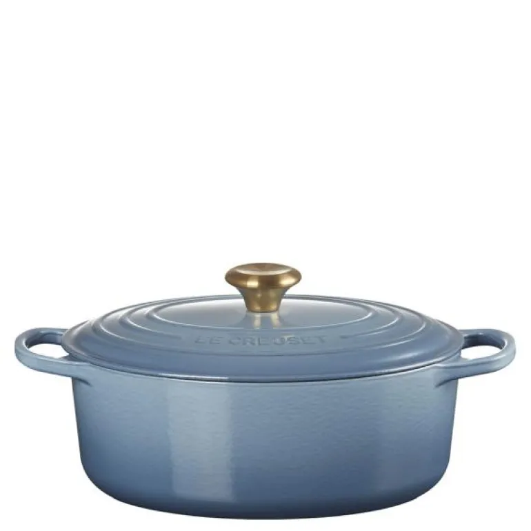 Oval støpejernsgryte 4,1 liter i fargen chambray med knott i rutfritt stål som har fått en lekker gullfinish. Gryten inngår i Siganture serien til Le Creuset. Den ovale gryten er like allsidig som den runde klassikeren. Den er også stor nok til å romme et lammelår og smal nok til at du får plass til tilbehøret ved siden av i ovnen. Med denne basisgryten for alle kokker kan du skape imponerende retter som er proppfulle av smak, uansett hva som står på menyen.