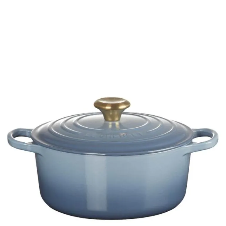Rund støpejernsgryte 4,2 liter i fargen chambray, med knott i rutfritt stål med gullfinish. Den runde støpejernsgryten fra Le Creusets Siganture-serie er en uunnværlig klassiker på kjøkkenet. Gryten har blitt fremstilt i høyeste kvalitet på Le Creusets eget støperiet i Frankrike siden 1925. Støpejern er kjent for å være et av de beste materialene til matlaging, da varmen fordeles jevnt og ensartet i gryten. Dette gjør den ideell til f.eks. langkokte retter eller grytebrød.Støpejernsgryten holder seg varm lenge etter at du slår av varmen, noe som gir mulighet for energivennlig matlaging. Samtidig er denne egenskapen optimal til servering av den ferdiglagede retten, som holdes varm ved bordet.n.