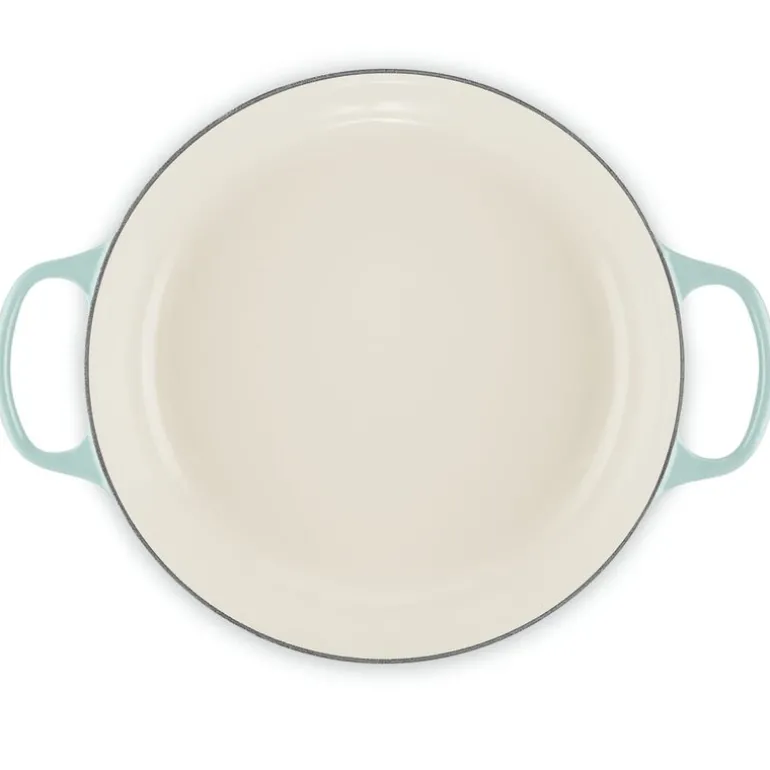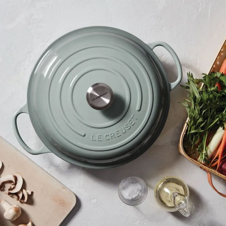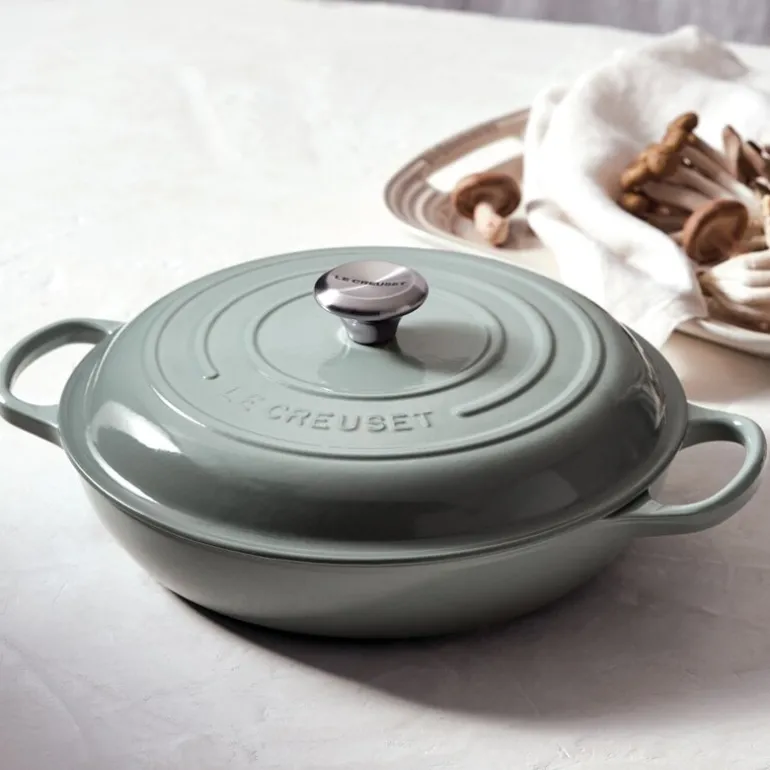 Signature buffetgryte i støpejern, 30 cm, 3,5L i fargen Sea Salt fra Le Creuset er en allsidig og elegant gryte som løfter matlagingen din til nye høyder. Med sitt brede, flate design og grunne sider er den ideell for alt fra kremet risotto til mørt kjøtt og sprø, gyldne paier. Buffetgryten gir deg uendelige muligheter, enten du vil småkoke gryteretter, steke grønnsaker eller bake smakfulle retter.