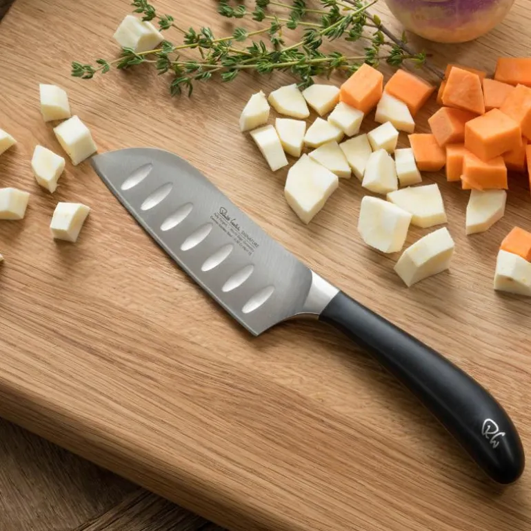 Signature santokukniv 11cm har en japansk stil med brede blader. Santoku-kniven er spesielt egnet for presisjonsskjæring og terninger av grønnsaker. Fordypningene på bladet reduserer friksjonen og gjør det enkelt å kutte.Alle Robert Welch Signature kniver leveres i stilig gaveemballasje, kan vaskes i maskin og har 25 års garanti.