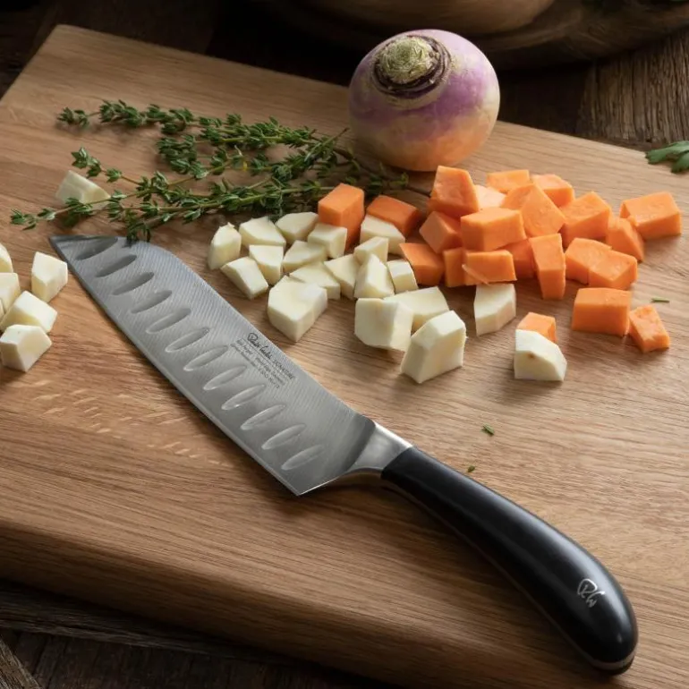 Signature santokukniv 17cm har en japansk stil med brede blader. Santoku-kniven er spesielt egnet for presisjonsskjæring og terninger av grønnsaker. Fordypningene på bladet reduserer friksjonen og gjør det enkelt å kutte.Alle Robert Welch Signature kniver leveres i stilig gaveemballasje, kan vaskes i maskin og har 25 års garanti.