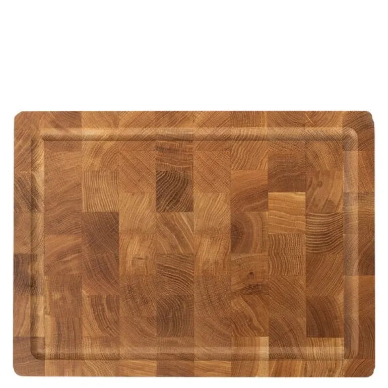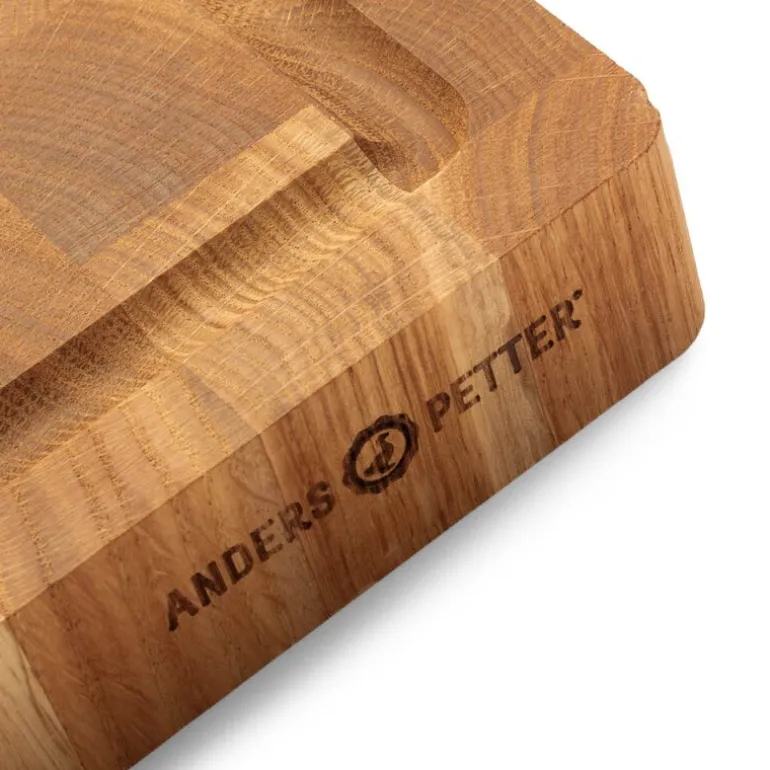 Signerat skjærebrett 38×28 cm fra Anders Petter er laget av eik og produsert i Europa. Dette robuste skjærebrettet har en forsunket renne med avrinningsfunksjon som effektivt samler opp overflødig væske, noe som gjør det ideelt for skjæring av saftige matvarer som kjøtt eller frukt. Det slitesterke eiketreet gir brettet et naturlig og tidløst preg, samtidig som det er svært funksjonelt.