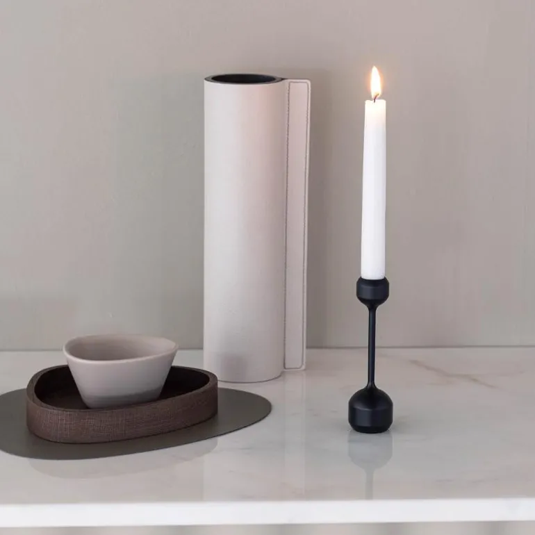 Silhouette 145 svartstål. Nøye formet med forenklede kurver og gjentatte proporsjoner er den tidløse Silhouette 145 lysestaken i svartbelagt solid stål en organisk passform for enhver plass. Plasser den individuelt eller i en samling med flere og opplev hvordan utseendet til interiørstylingen din endres på et blunk. Silhouette 145 lysestaken passer til tradisjonelle stearinlys så vel som LED-lys.