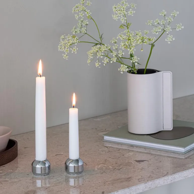 Silhouette 34 sett kromstål. Med sin enkle og organiske form er det tidløse Silhouette sett 34 i krombelagt solid stål et klassisk designelement for enhver plass. Plasser den individuelt eller i en samling med flere deler og opplev hvordan utseendet til interiørstylingen din endres på et blunk. Silhouette 34 sett med to lysestaker passer til tradisjonelle stearinlys så vel som LED-lys.