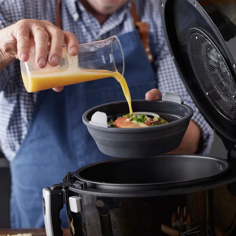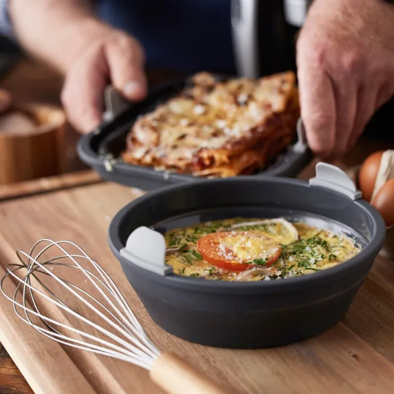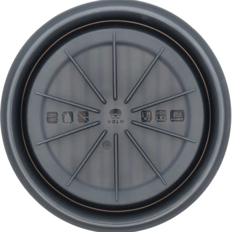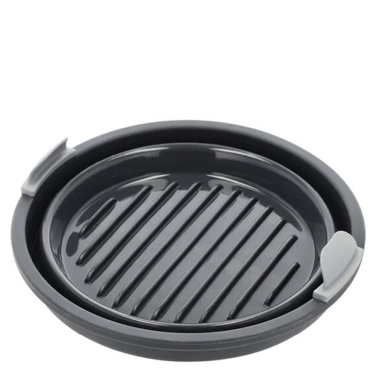 Holm rund silikonform i grå, måler 19 cm i diameter og 6 cm i høyde, og er spesielt designet for bruk i airfryer. Denne runde formen gjør det enkelt å holde airfryeren ren ved å forhindre klissete eller brente matrester.