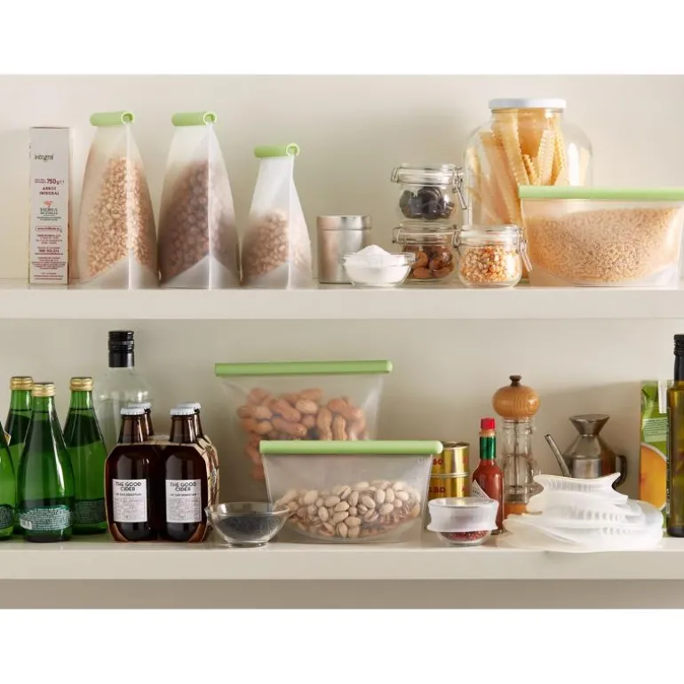 Lékués silikonposer er fremstilt av 100% Platinum Food Grade Silikon. De er 100% lufttette og kan både oppbevares stående og liggende. De tåler frost og kan også fint has i mikroovnen til oppvarmning og tining. Det er et lite skrivefelt på alle posene, og de tåler oppvaskmaskin, så de er lette å holde rene.