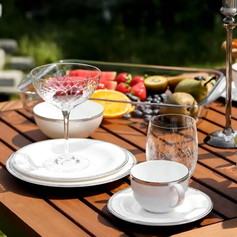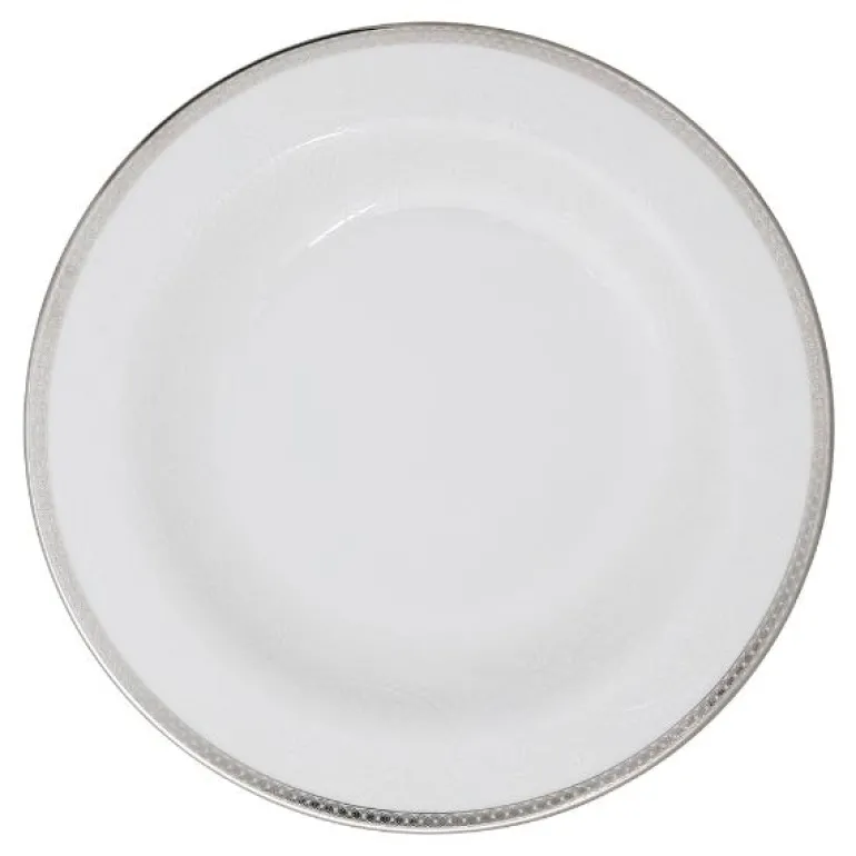 Tallerken 21 cm i serviset Silver Paisley fra Royal Porcelain. Klassisk og tidløs, elegant og romantisk. Silver Paisley-serien fra Royal Porcelain kombinerer maskuline, stramme linjer med et delikat, romantisk mønster. Et design som gjør Silver Paisley like anvendelig som det er vakkert. Silver Paisley er festserviset du aldri blir lei av å ta frem, og er en serie du kan samle på hele livet. Hvorfor ikke sette dette serviset på ønskelisten til bryllupet?Serien er produsert av Royal Porcelain, en av Norges største merkevarer innen serviser. Silver Paisley er laget av benporselen, som er den aller fineste type porselen. Serien tåler oppvaskmaskin, men som med alle serviser med sølv eller gullkant bør serviset ikke vaskes med temperatur over 50 grader og det bør brukes halv dose med vaskemiddel. Fås kun hos Tilbords. Silver Paisley er et komplett festservise som inneholder alt du trenger til de ekstra spesielle anledningene. Det rene, tidløse designet gjør at serviset er like aktuell til alle årstider og kan kombineres med bordpynt i dine favorittfarger. Serien inneholder tallerkener i ulike størrelser – til forrett, hovedrett og dessert – serveringsfat i flere størrelser, suppeterrin, sausenebb og salatbolle. I tillegg finner du selvsagt et komplett kaffeservise.