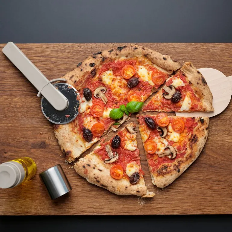 Inkludert i settet finner du Singles pizzahjul, Singles oljespray i elegant Soft Taupe, og en multifunksjonell spatel i bøketre som måler 18 x 10 cm. Singles pizzahjul kombinerer form og funksjon på en måte som både er praktisk og stilfull. Det rustfrie stålet i bladet sikrer langvarig holdbarhet og presise snitt, uansett hvor tykk pizzabunnen er. Hjulet er ergonomisk utformet for å ligge godt i hånden, og med et enkelt trykk av tommelen kan du skjære gjennom pizzaen med letthet.