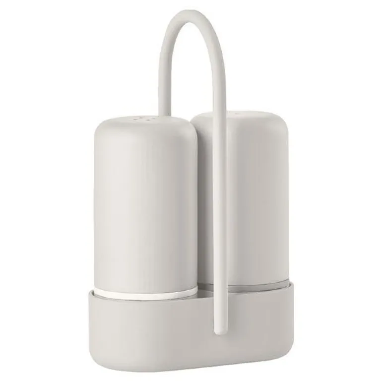 Med dette paret fra Zone Singles blir det enklere å huske å sette frem salt og pepper på bordet. De er nemlig plassert i en praktisk holder med håndtak, slik at du enkelt kan flytte dem med én hånd. En diskret ring gjør det enkelt å se forskjellen på salt og pepper. Sammen er de et så elegant par at de kommer til å havne på gjestelisten til alle middagene dine.