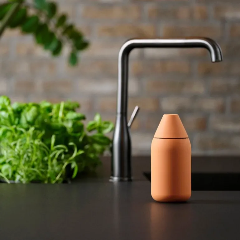 Singles såpebeholder apricot fra Zone kombinerer funksjonalitet og elegant design på en imponerende måte. Den unike, rakettformede formen gir et moderne uttrykk som skiller seg ut på vasken, samtidig som den brede, sylindriske basen sørger for at dispenseren står stabilt. Med et lett trykk doserer du enkelt riktig mengde såpe fra åpningen på toppen, og når det er behov for påfyll, kan lokket skrus av med et enkelt håndgrep.